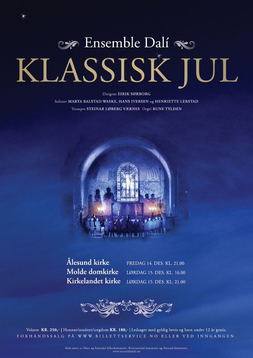 For femte året på rad inviterer vi til Klassisk jul med Ensemble Dalí, fredag 14. og lørdag 15. desember. Som vanlig samles ensemblet fredag ettermiddag, og tar sikte på å fylle hele regionen med vakker kormusikk i løpet av det nærmeste halvannet døgnet. I år starter vi i Ålesund kirke og jobber oss oppover mot Kristiansund og Kirkelandet kirke, via vakre Molde domkirke. For detaljer, se bilde over.